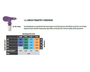- Type: FineFinish spuittip voor airless spuitsystemen, speciaal voor lakken en hoogwaardige coatings.